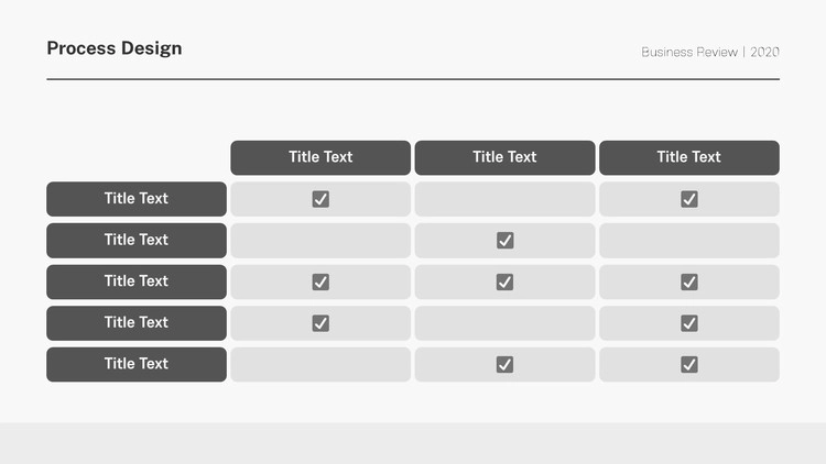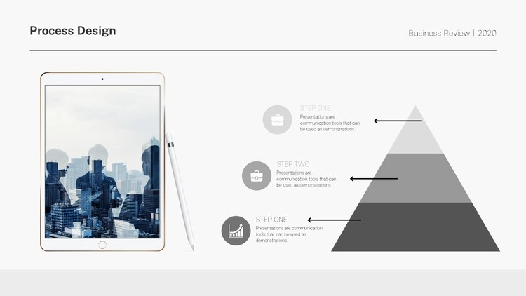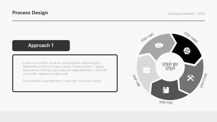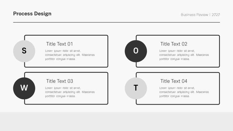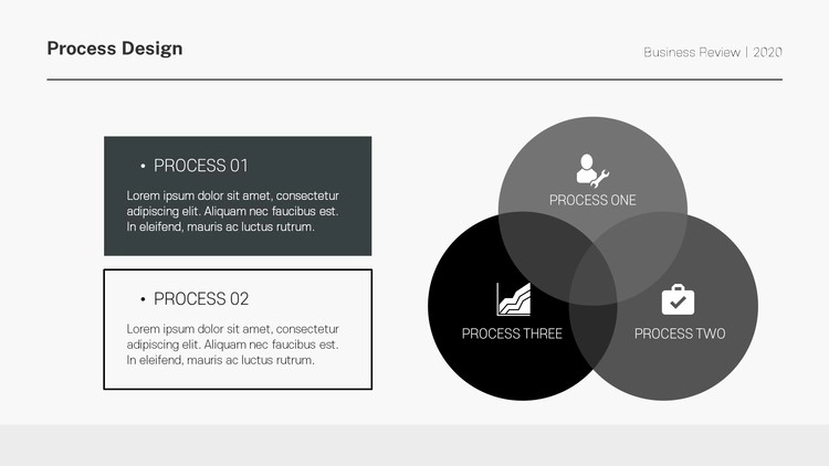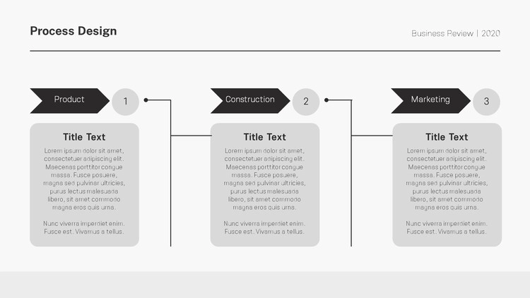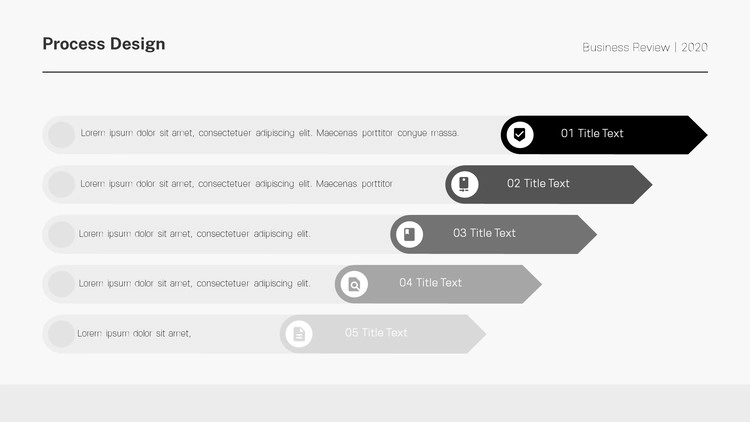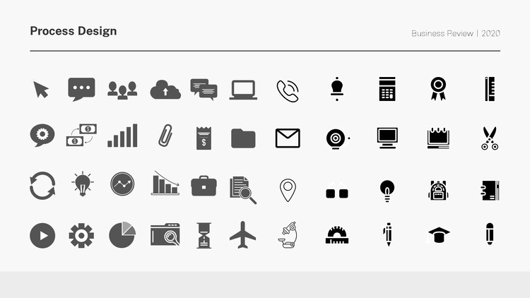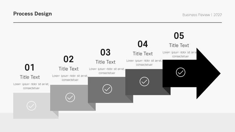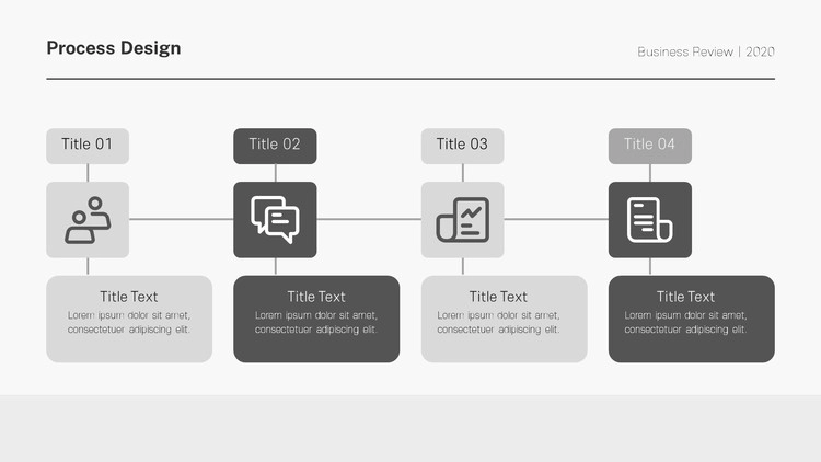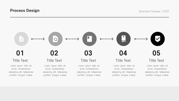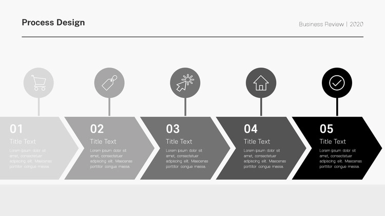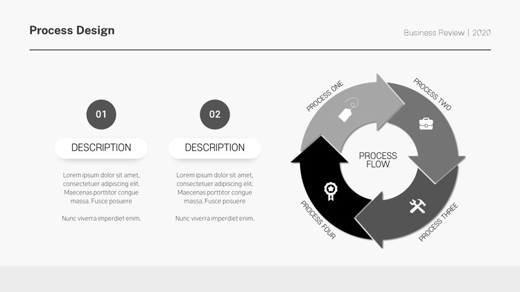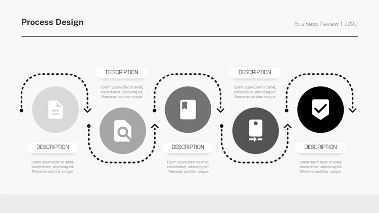 화살표 디자인 및 원형 도형 개체를 활용한 프로세스 양식, 아이콘 개체를 사용한 디자인, 차트 형식의 흐름도 등 각종 형식의 프로세스 디자인으로 제작을 했으며 그레이, 블랙 등 무채색 색 조합 구성으로 작업을 했습니다. 제작하는 테마에 맞게 컬러 구성을 변경할 수 있습니다.
