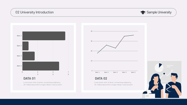깔끔한 남색 컬러 조합을 활용하여 전체 슬라이드에 작업을 했으며 학생 일러스트 아이콘 개체, 연구 자료 발표를 위한 그래프 디자인, 도형 디자인 등 각종 디자인 소스를 활용하여 원하는 피피티를 완성할 수 있습니다.